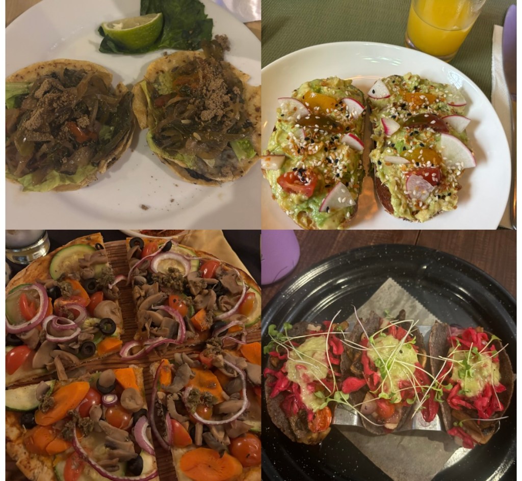 I went for a mix of traditional vs. familiar when I visited Merida. The top left is a traditional Maya dish from the Yucatán Peninsula called Panuchos–corn tortilla stuffed with black beans and topped with avocado and vegetables. My grandpa was born in Tamaulipas, which is in the central eastern part of Mexico, so I have very little knowledge of food from the South of Mexico; the panuchos were a really cool experience. Top right: Yes, I am an average white girl who loves avocado toast, but I will also say that I resent the idea that avocados are a white girl thing when they’ve grown on trees in Mesoamerica for the last 10,000 years, and gringolandia MAYBE started to think about putting avocado on bread in like, 2014. Bottom left is a loaded veggie pizza. Right is veggie tacos. Both delicious !!!