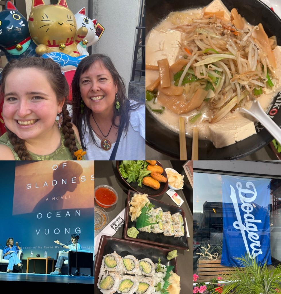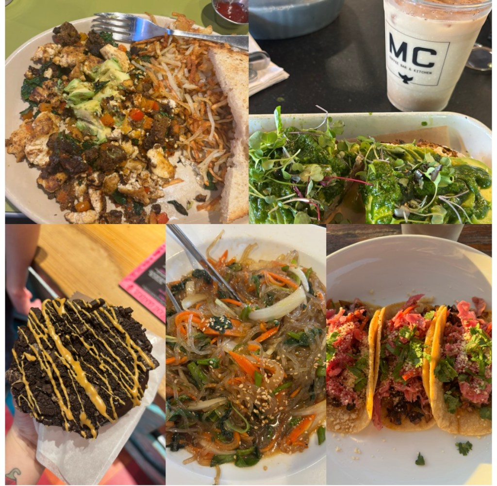 My mom and I went to Little Tokyo for Ocean Vuong’s book tour of Emperor of Gladness in Summer 2025! We found this ramen place, Daikokuya, that had a TON of vegan options. My mom and I still talk about this white-bean, veggie, & tofu ramen at least twice a month. We absolutely loved it. The avocado rolls were really good, but it was pretty much what you’d expect from avocado rolls. The tofu nuggets were fire, but my mom didn’t like them because she’s healthier than I am. Also, Ocean Vuong talked about what it means to be a citizen of the world, what it means to forgive, what it means to clear your mind, how art is the root of all true connection, and the unexpected ways that trauma manifests. So, in other words, my mom and I were in actual tears by the end of what was one of the most profoundly spiritually moving experiences ever. This second set of images is mostly from 33 Taps, which is another restaurant I brought my mom to. 33 Taps is a chain sports bar with many locations across L.A., but we went to the downtown one because it was right across the street from the convention center for the AWP writers’ conference (Spring 2025). Ultimate staycation! Such a fun trip with my mom. We would take classes on creative writing during the day, and I would sell copies of my first book at one of the booths, then at night, we would go hog wild on the vegan junk food (banh mi fries w/vegan “chicken,” vegan spicy “mayo,” cilantro, pickled vegetables, and sweet thai chili sauce. We also talk about these fries once a month. I had to inherit my love of food from someone. The other things are a loaded vegan burger and spicy buffalo cauliflower wings), and then yap in the hotel room for hours. The other two pics, bottom left was a surprisingly great option at Universal Studios City Walk (spicy cauliflower, potato, onion, & cilantro tacos with black beans) and vegan miso “sushi,” at a small Japanese place right outside Universal Studios.Noticing a pattern here: the vast majority of my favorite restaurant meals in the L.A. area are with my mom… she’s fr the best restaurant companion. There is nothing worse than going to a restaurant with someone who doesn’t care about the experience of cuisine, tasting each other’s dishes, comparing and contrasting the flavors together…lol. Anyways, the top left is at Snooze Eatery. It’s a tofu scramble with vegan “sausage,” spinach, red pepper, mushrooms, avocado, and hashbrowns. This is my mom and I’s go-to brunch spot. Now our go-to dinner spot is either Kaju Soft Tofu (Korean) or Seabirds (vegan). That leaves the top right, which is my favorite cafe to get work done: Millcross. That beauty is a tahini and avocado toast. Almost makes the suffering afterward worth it (I found out I’m allergic to gluten this year, but sometimes, it’s too good NOT to eat). Bottom left is a, get ready, chocolate peanut butter Oreo cookie donut (and it’s vegan) from Voodoo Donuts–yes, we have Voodoo in L.A. and not just in Portland!