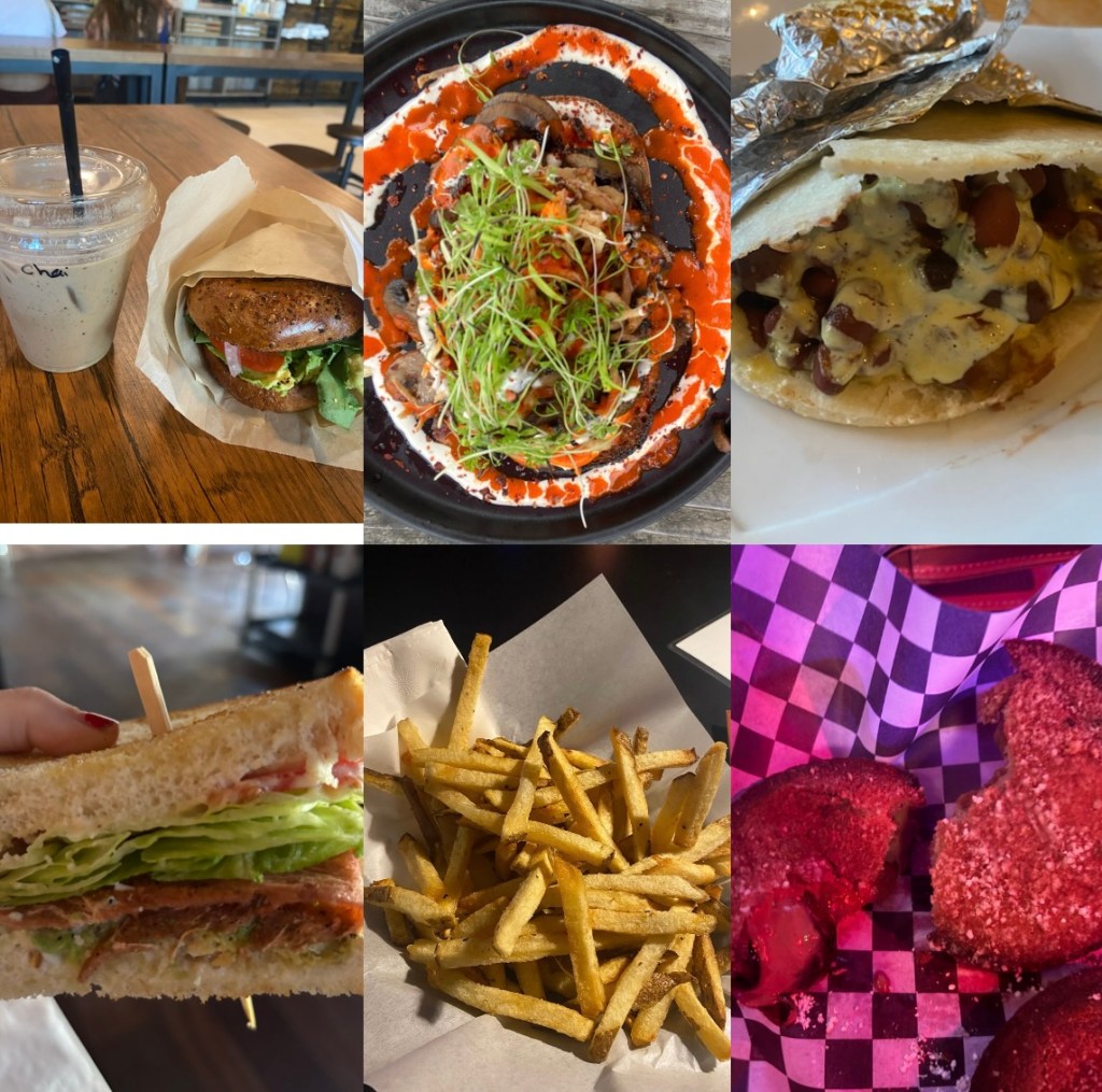Portland food is a real memory lane experience because I lived here during college. Top left is my go-to order from Rose City Coffee, where I would work on my first book (Chrysalis) every Saturday morning and afternoon. Every single Saturday, I walked 6 miles (there and back) and got a poppy bagel sandwich with avocado, hummus, tomato, raw onion, and spinach, plus an iced chai with hemp milk. Next one is a vegan cashew “cheese,” mushroom, fried onions, arugula, and red aioli toast–my go-to hangover breakfast at Cafe Rowan. Third is what I ate anytime I was homesick, at one of Portland’s only Colombian restaurants, Que Bacano. It’s a stuffed arepa (savory corn cake) with red beans and a secret sauce/vegan aioli. The bottom row is the delicious garbage I ate every Friday and Saturday night when I was super drunk. The sandwich is a vegan BLT (vegan “bacon,” lettuce, tomato, avocado, & garlic aioli) at one of my fav bars, Hungry Tiger. You better believe this sandwich and the vegan corndogs absolutely hit the spot after 4 shots of tequila. Second is the fries my ex and I used to split (after we were broken up), because it’s always a good idea to get drinks with an ex and touch each other’s shoulders weirdly the whole time. In all seriousness, these fries from Bar of the Gods are THE best fries I have ever had in my entire life. The last is a deep-fried peanut butter & jelly sandwich at Quarterworld bar and arcade. I celebrated many a friend’s birthday parties here. I have not lived in Portland for 3 years, and I still think about that deep-fried PB&J every time I get my period. My hormones will forever crave it.